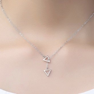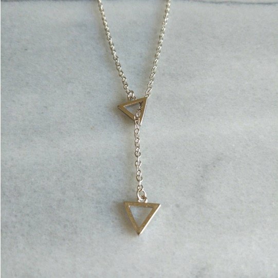 This sleek pendant features two mini triangles in a unique arrangement, creating a stylish minimalist lariat style pendant.